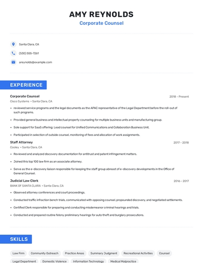 Build a professional corporate counsel resume in minutes. Browse through our resume examples to identify the best way to word your resume. Then choose from 5+ resume templates to create your corporate counsel resume.