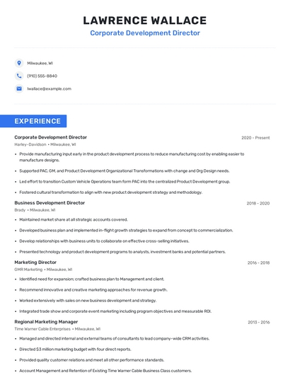 Build a professional corporate development director resume in minutes. Browse through our resume examples to identify the best way to word your resume. Then choose from 5+ resume templates to create your corporate development director resume.