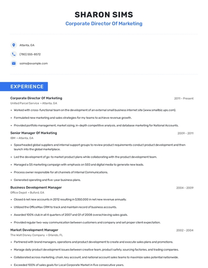 Build a professional corporate director of marketing resume in minutes. Browse through our resume examples to identify the best way to word your resume. Then choose from 5+ resume templates to create your corporate director of marketing resume.