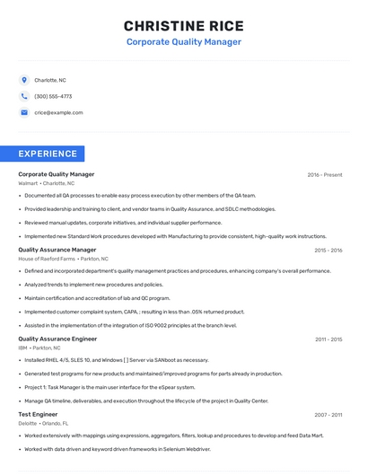 Build a professional corporate quality manager resume in minutes. Browse through our resume examples to identify the best way to word your resume. Then choose from 5+ resume templates to create your corporate quality manager resume.