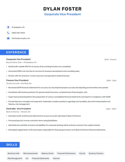 Build a professional corporate vice president resume in minutes. Browse through our resume examples to identify the best way to word your resume. Then choose from 5+ resume templates to create your corporate vice president resume.