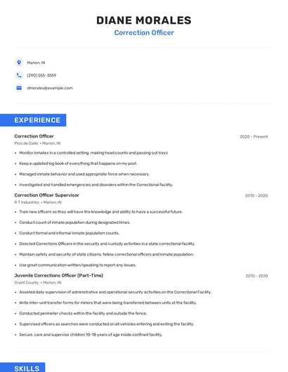 Build a professional correction officer resume in minutes. Browse through our resume examples to identify the best way to word your resume. Then choose from 5+ resume templates to create your correction officer resume.