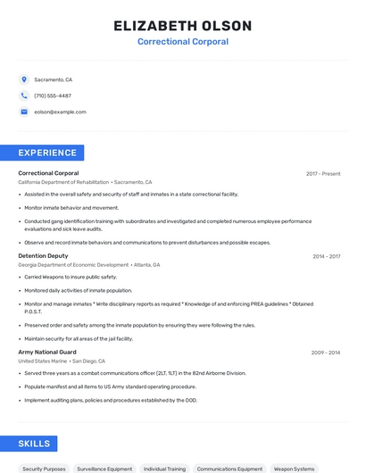 Build a professional correctional corporal resume in minutes. Browse through our resume examples to identify the best way to word your resume. Then choose from 5+ resume templates to create your correctional corporal resume.