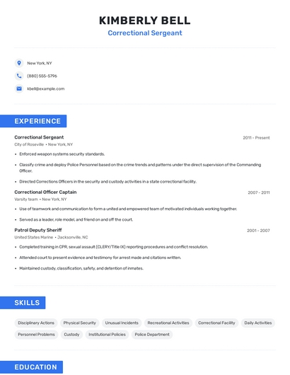 Build a professional correctional sergeant resume in minutes. Our AI resume writing assistant will guide you through every step of the process, and you can choose from 10+ resume templates to create your correctional sergeant resume.7. Emergency Situations