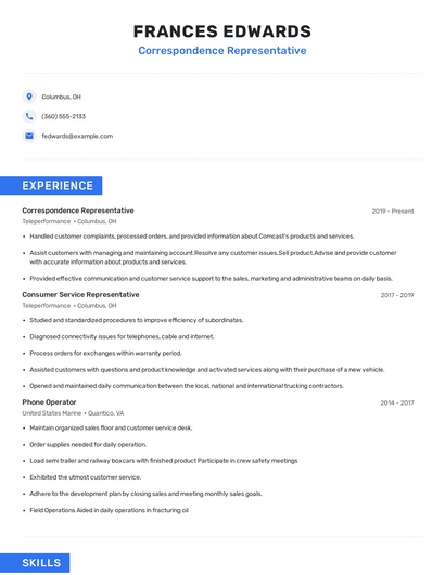 Build a professional correspondence representative resume in minutes. Browse through our resume examples to identify the best way to word your resume. Then choose from 5+ resume templates to create your correspondence representative resume.