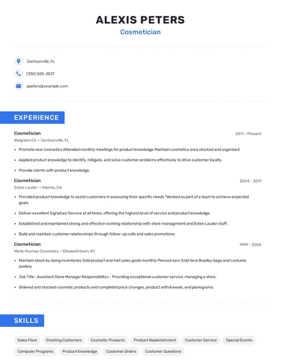 Build a professional cosmetician resume in minutes. Our AI resume writing assistant will guide you through every step of the process, and you can choose from 10+ resume templates to create your cosmetician resume.7. Cash Drawers