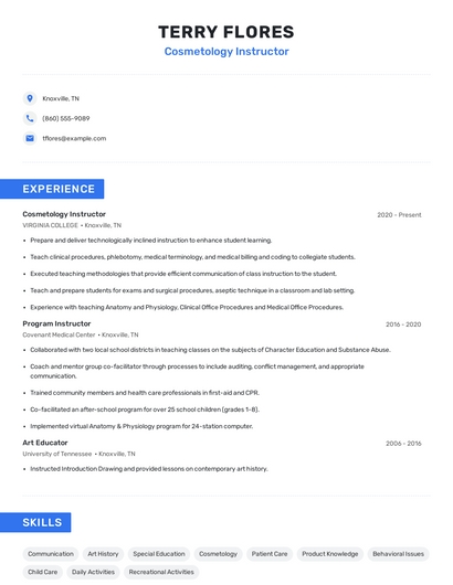 Build a professional cosmetology instructor resume in minutes. Browse through our resume examples to identify the best way to word your resume. Then choose from 5+ resume templates to create your cosmetology instructor resume.