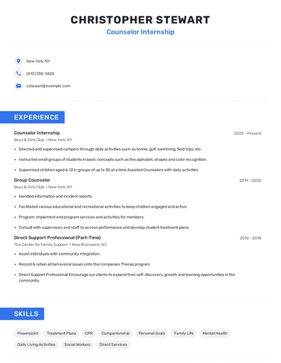 Build a professional counselor internship resume in minutes. Browse through our resume examples to identify the best way to word your resume. Then choose from 5+ resume templates to create your counselor internship resume.