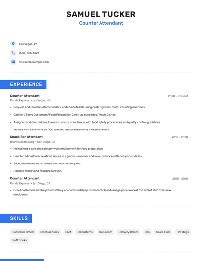 Build a professional counter attendant resume in minutes. Browse through our resume examples to identify the best way to word your resume. Then choose from 5+ resume templates to create your counter attendant resume.