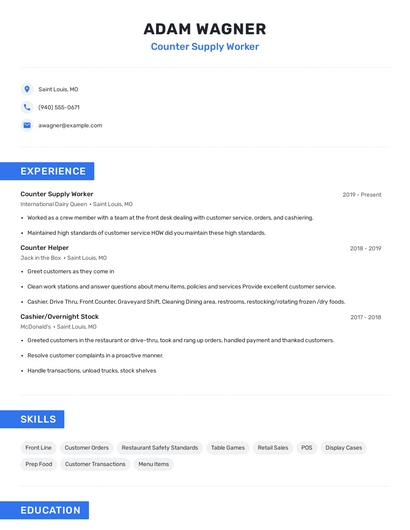 Build a professional counter supply worker resume in minutes. Our AI resume writing assistant will guide you through every step of the process, and you can choose from 10+ resume templates to create your counter supply worker resume.7. Food Service