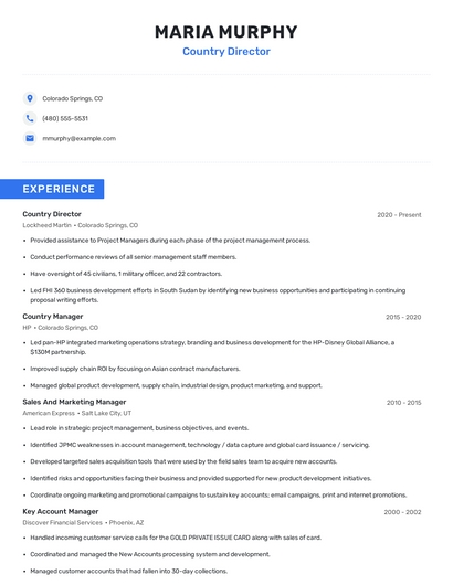 Build a professional country director resume in minutes. Browse through our resume examples to identify the best way to word your resume. Then choose from 5+ resume templates to create your country director resume.
