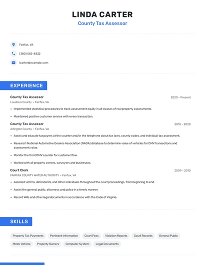 Build a professional county tax assessor resume in minutes. Our AI resume writing assistant will guide you through every step of the process, and you can choose from 10+ resume templates to create your county tax assessor resume.7. Title Transfers