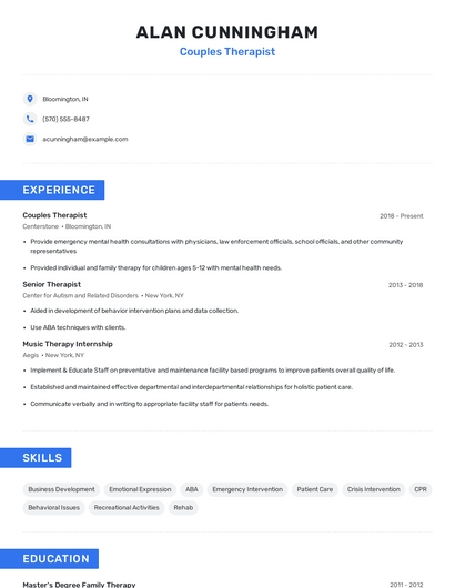 Build a professional couples therapist resume in minutes. Our AI resume writing assistant will guide you through every step of the process, and you can choose from 10+ resume templates to create your couples therapist resume.7. Substance Abuse