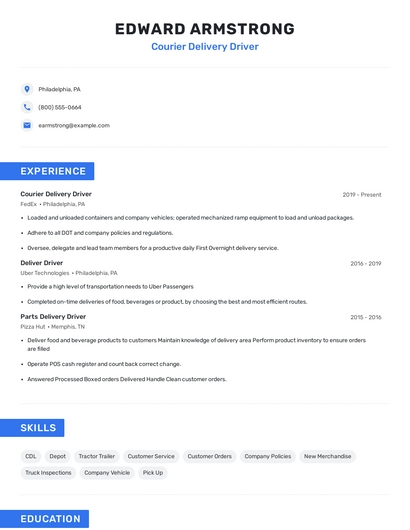 Build a professional courier delivery driver resume in minutes. Browse through our resume examples to identify the best way to word your resume. Then choose from 5+ resume templates to create your courier delivery driver resume.