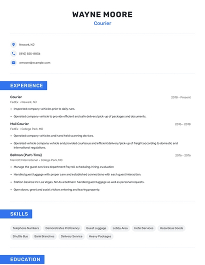 Build a professional courier resume in minutes. Browse through our resume examples to identify the best way to word your resume. Then choose from 5+ resume templates to create your courier resume.