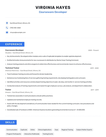 Build a professional courseware developer resume in minutes. Browse through our resume examples to identify the best way to word your resume. Then choose from 5+ resume templates to create your courseware developer resume.