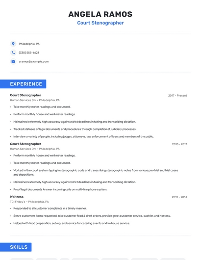 Build a professional court stenographer resume in minutes. Our AI resume writing assistant will guide you through every step of the process, and you can choose from 10+ resume templates to create your court stenographer resume.What skills help Court Stenographers find jobs?