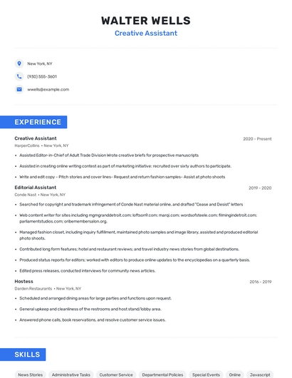 Build a professional creative assistant resume in minutes. Browse through our resume examples to identify the best way to word your resume. Then choose from 5+ resume templates to create your creative assistant resume.
