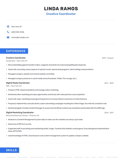 Build a professional creative coordinator resume in minutes. Browse through our resume examples to identify the best way to word your resume. Then choose from 5+ resume templates to create your creative coordinator resume.