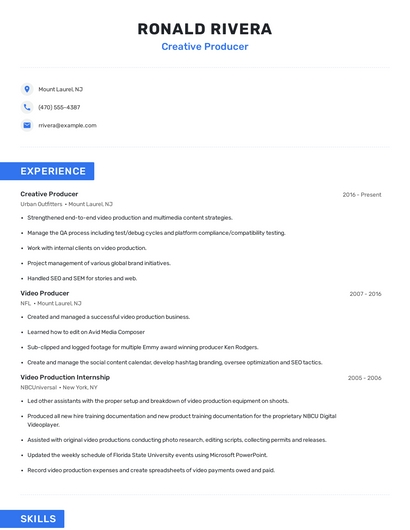 Build a professional creative producer resume in minutes. Browse through our resume examples to identify the best way to word your resume. Then choose from 5+ resume templates to create your creative producer resume.