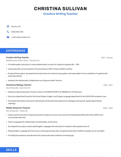 Build a professional creative writing teacher resume in minutes. Browse through our resume examples to identify the best way to word your resume. Then choose from 5+ resume templates to create your creative writing teacher resume.