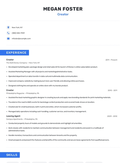 Build a professional creator resume in minutes. Browse through our resume examples to identify the best way to word your resume. Then choose from 5+ resume templates to create your creator resume.