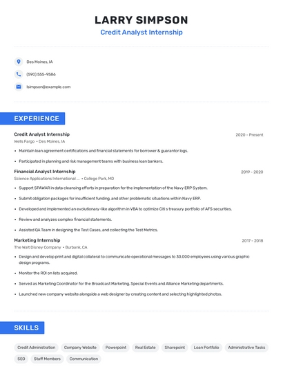 Build a professional credit analyst internship resume in minutes. Browse through our resume examples to identify the best way to word your resume. Then choose from 5+ resume templates to create your credit analyst internship resume.