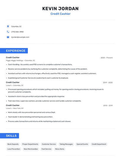 The most important skills for a credit cashier resume and required skills for a credit cashier to have include: