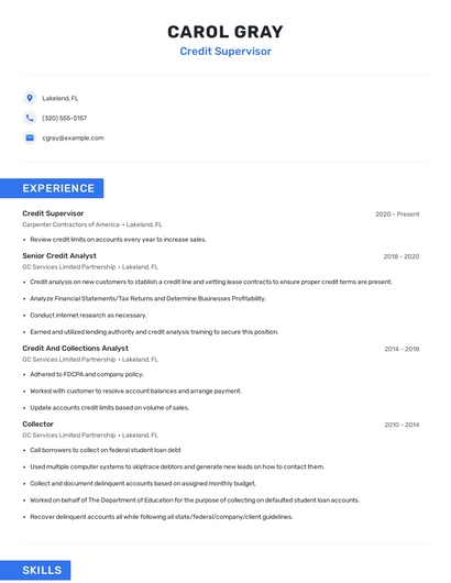 Build a professional credit supervisor resume in minutes. Browse through our resume examples to identify the best way to word your resume. Then choose from 5+ resume templates to create your credit supervisor resume.