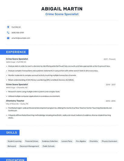 Build a professional crime scene specialist resume in minutes. Our AI resume writing assistant will guide you through every step of the process, and you can choose from 10+ resume templates to create your crime scene specialist resume.7. Digital Photography