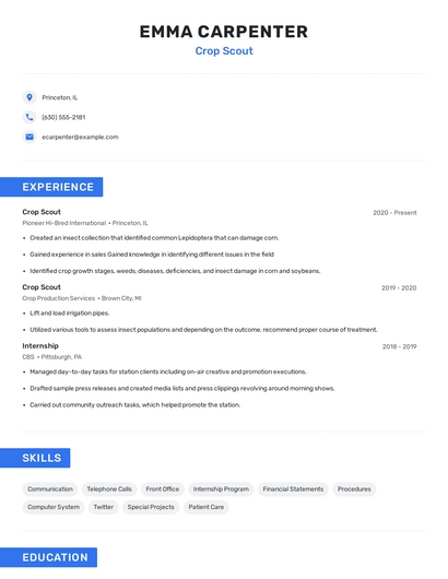 Build a professional crop scout resume in minutes. Our AI resume writing assistant will guide you through every step of the process, and you can choose from 10+ resume templates to create your crop scout resume.7. Population Counts