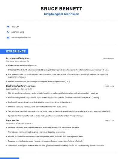 Build a professional cryptological technician resume in minutes. Browse through our resume examples to identify the best way to word your resume. Then choose from 5+ resume templates to create your cryptological technician resume.