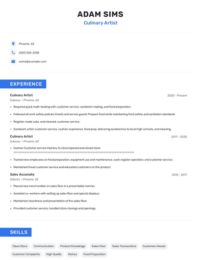 Build a professional culinary artist resume in minutes. Our AI resume writing assistant will guide you through every step of the process, and you can choose from 10+ resume templates to create your culinary artist resume.What skills help Culinary Artists find jobs?