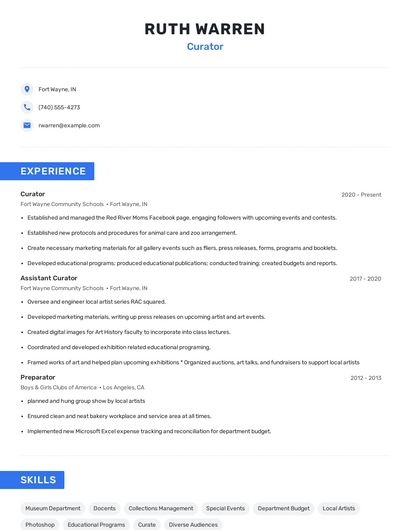 Build a professional curator resume in minutes. Browse through our resume examples to identify the best way to word your resume. Then choose from 5+ resume templates to create your curator resume.