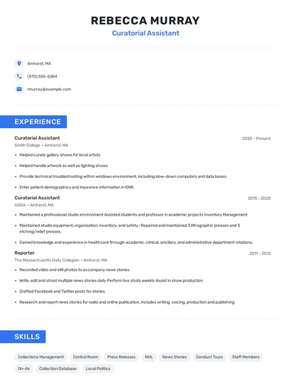 Build a professional curatorial assistant resume in minutes. Browse through our resume examples to identify the best way to word your resume. Then choose from 5+ resume templates to create your curatorial assistant resume.