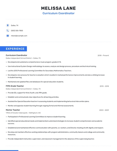 Build a professional curriculum coordinator resume in minutes. Browse through our resume examples to identify the best way to word your resume. Then choose from 5+ resume templates to create your curriculum coordinator resume.