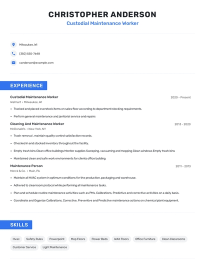 Build a professional custodial maintenance worker resume in minutes. Browse through our resume examples to identify the best way to word your resume. Then choose from 5+ resume templates to create your custodial maintenance worker resume.