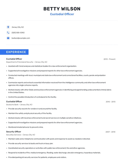 Build a professional custodial officer resume in minutes. Browse through our resume examples to identify the best way to word your resume. Then choose from 5+ resume templates to create your custodial officer resume.