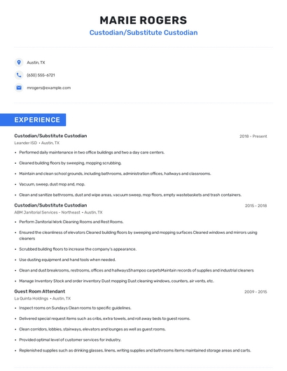 Build a professional custodian/substitute custodian resume in minutes. Browse through our resume examples to identify the best way to word your resume. Then choose from 5+ resume templates to create your custodian/substitute custodian resume.