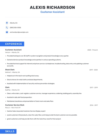 Build a professional customer assistant resume in minutes. Browse through our resume examples to identify the best way to word your resume. Then choose from 5+ resume templates to create your customer assistant resume.