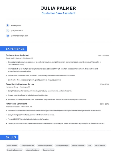 Build a professional customer care assistant resume in minutes. Browse through our resume examples to identify the best way to word your resume. Then choose from 5+ resume templates to create your customer care assistant resume.