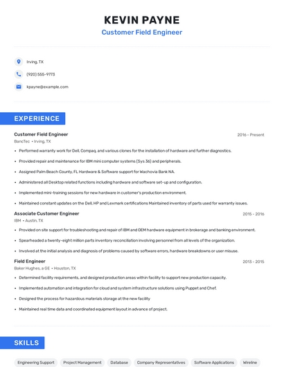 Build a professional customer field engineer resume in minutes. Browse through our resume examples to identify the best way to word your resume. Then choose from 5+ resume templates to create your customer field engineer resume.