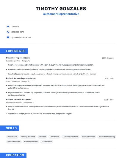 Build a professional customer representative resume in minutes. Our AI resume writing assistant will guide you through every step of the process, and you can choose from 10+ resume templates to create your customer representative resume.7. Patients