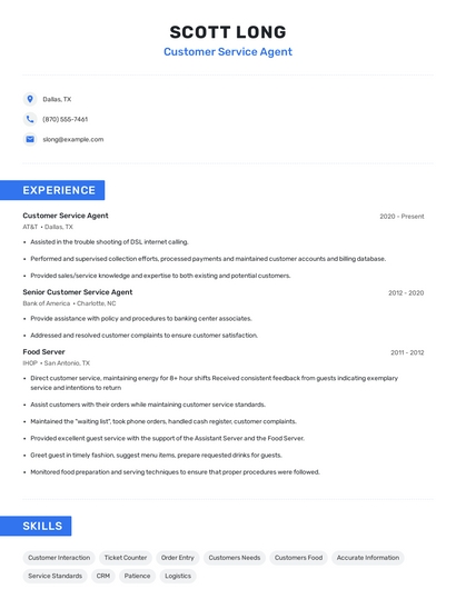 Build a professional customer service agent resume in minutes. Browse through our resume examples to identify the best way to word your resume. Then choose from 5+ resume templates to create your customer service agent resume.
