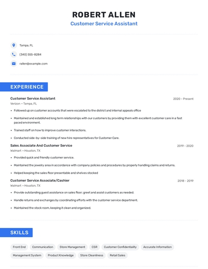 Build a professional customer service assistant resume in minutes. Our AI resume writing assistant will guide you through every step of the process, and you can choose from 10+ resume templates to create your customer service assistant resume.7. H E