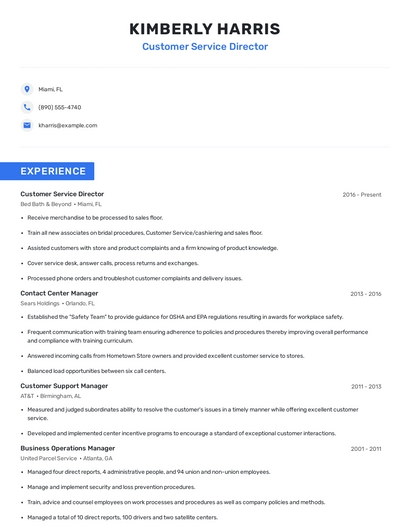 Build a professional customer service director resume in minutes. Browse through our resume examples to identify the best way to word your resume. Then choose from 5+ resume templates to create your customer service director resume.