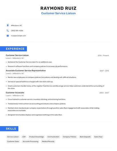 Build a professional customer service liaison resume in minutes. Browse through our resume examples to identify the best way to word your resume. Then choose from 5+ resume templates to create your customer service liaison resume.