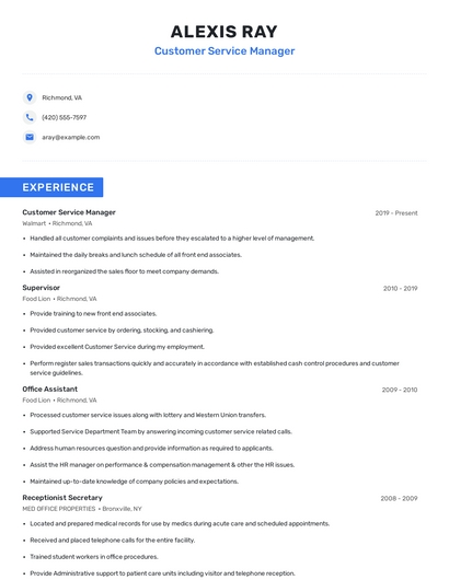 Build a professional customer service manager resume in minutes. Browse through our resume examples to identify the best way to word your resume. Then choose from 5+ resume templates to create your customer service manager resume.