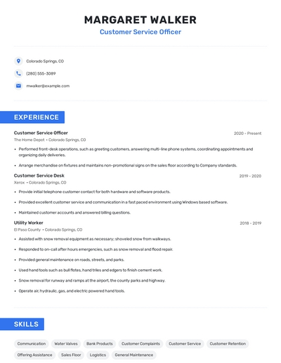Build a professional customer service officer resume in minutes. Browse through our resume examples to identify the best way to word your resume. Then choose from 5+ resume templates to create your customer service officer resume.