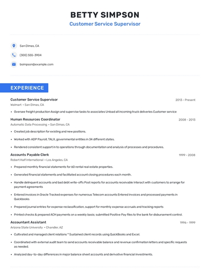 Build a professional customer service supervisor resume in minutes. Browse through our resume examples to identify the best way to word your resume. Then choose from 5+ resume templates to create your customer service supervisor resume.